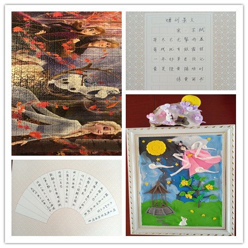 匡薇老师带来了自己和女儿的书法作品各一副,惊艳众人。黄小蕊老师、甘静老师、徐黄丽老师也展示了各自的硬笔书法作品。罗熙老师带来的彩泥手工--玉兔捣药、匡露老师带来的彩泥手工--嫦娥奔月,人物和物象都栩栩如生。郭佳老师和卞新珍老师的荷塘月色清雅动人。胡建华老师、彭丹老师、胡新莲老师还展示了和孩子们一起完成的手工作品,给大家送上了祝福。